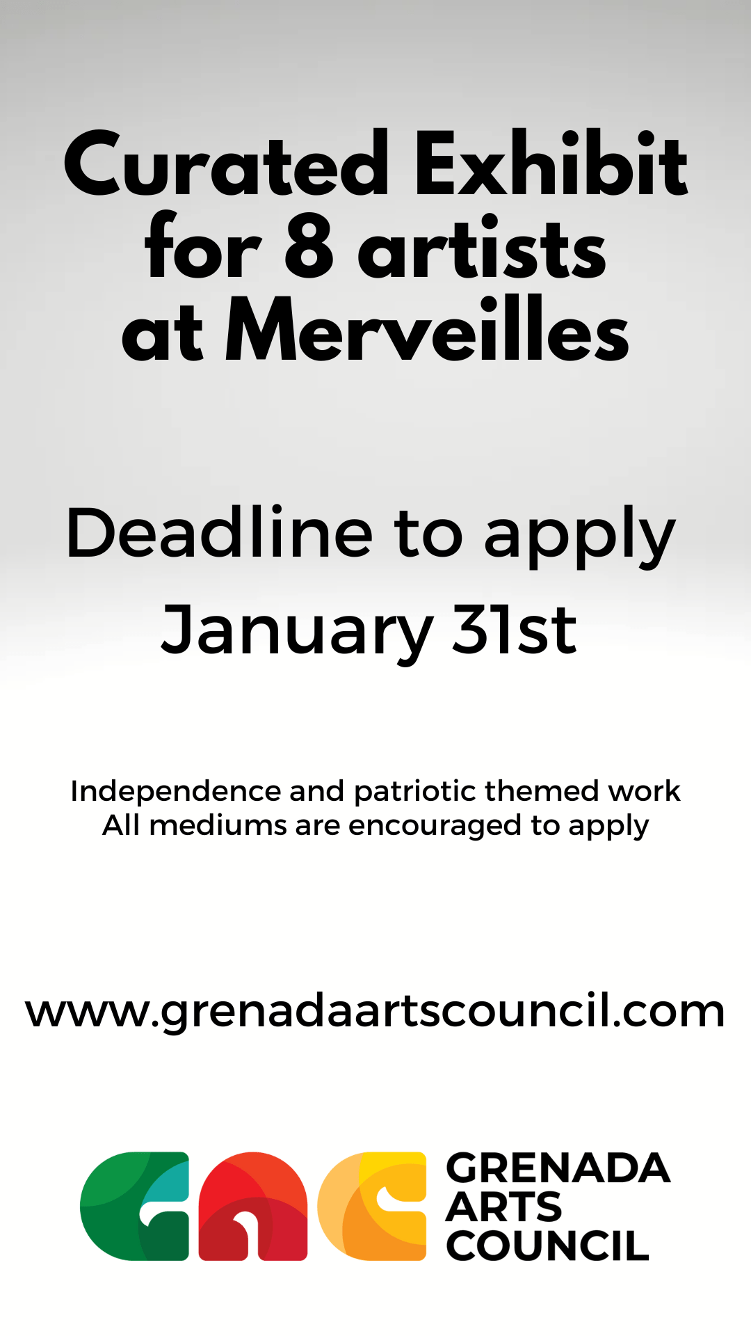 Grenada Arts Council has been given the opportunity to explore the new area of Port Louis called Merveilles as an exhibition venue. To begin, we would like to curate 8 artists to have work up, starting February 7th, for one week. Work should reflect independence or patriotic themes. 2D work should be a minimum of 24″x30″. Sculptures are also welcome. We see this as an opportunity to collaborate with the enthusiastic developers at Merveilles and a first step towards more exhibition opportunities.