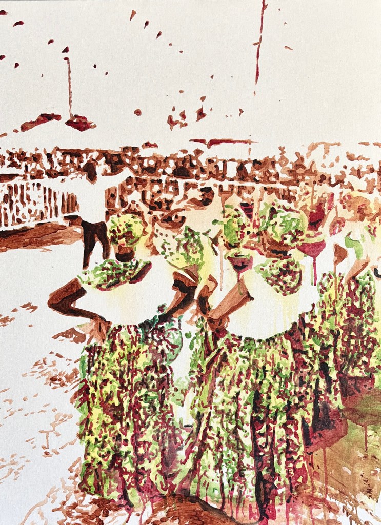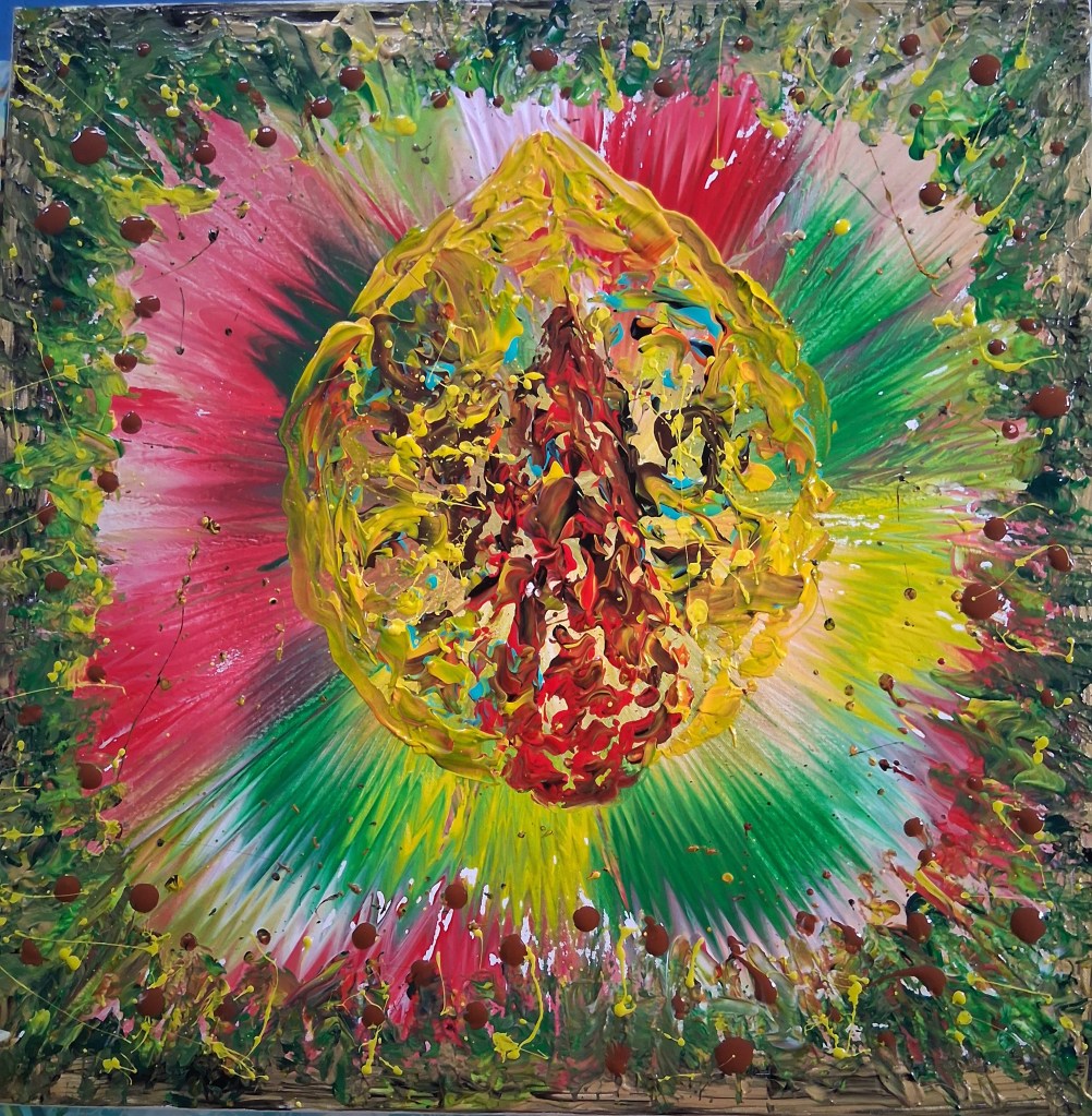 This painting is a celebration of the moment the nutmeg finally splits open. It’s more than just a harvest, it’s the fruit bursting with joy, just like the energy of the island especially during Independence. It captures the life and movement of our people showing who we truly are. And we are loud, vibrant, joyful, one people and extremely Proud!!