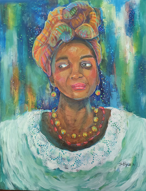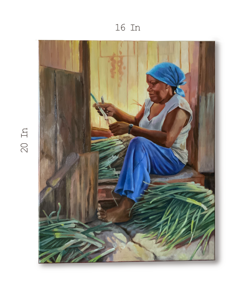 People, animals, and nature are frequently the subjects of my paintings. Although I prefer to concentrate on portraits, lately I have been enjoying capturing the environment and representing sometimes-overlooked activities. In this painting ‘Minding greens’, depicts a very welcoming woman I met on a very early morning stroll, she was packing green onions that she had just picked from her garden right before heading to church. The scene was tranquil, beautiful, and enticing to capture, specially with the sunrise light peaking through the foliage of her garden trees.