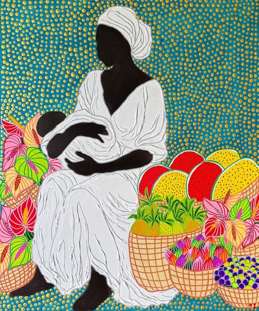 Inspired by the visual language of the Madonna and Child, this work reimagines maternal care through a Grenadian lens, honouring protection, nourishment, and quiet strength.