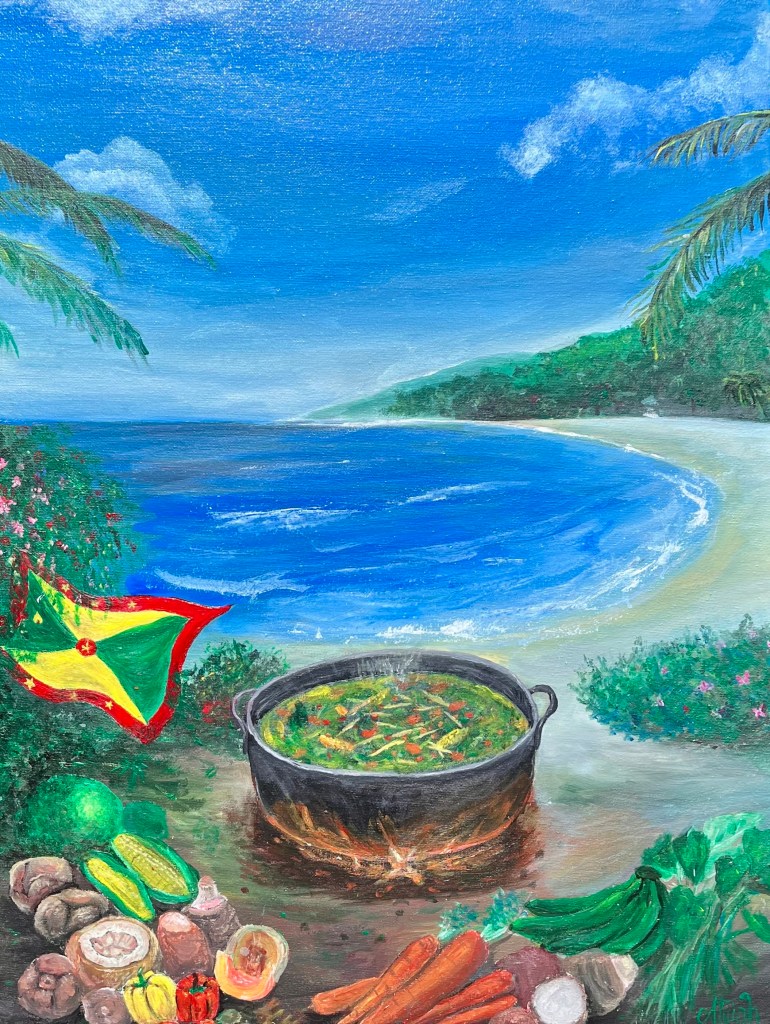 The national flag represents our sovereignty, sacrifice, and pride; the national dish reflects our shared table, where history, culture, and resilience meet; and the national flower symbolizes beauty, strength, and identity rooted in our land. Together, they embody the meaning of “One Pot, One People, One Nation”—a reminder that despite our differences, we are nourished by the same soil, traditions, and struggles. This painting honors Grenada’s journey to independence and the unity that continues to define us as a people.