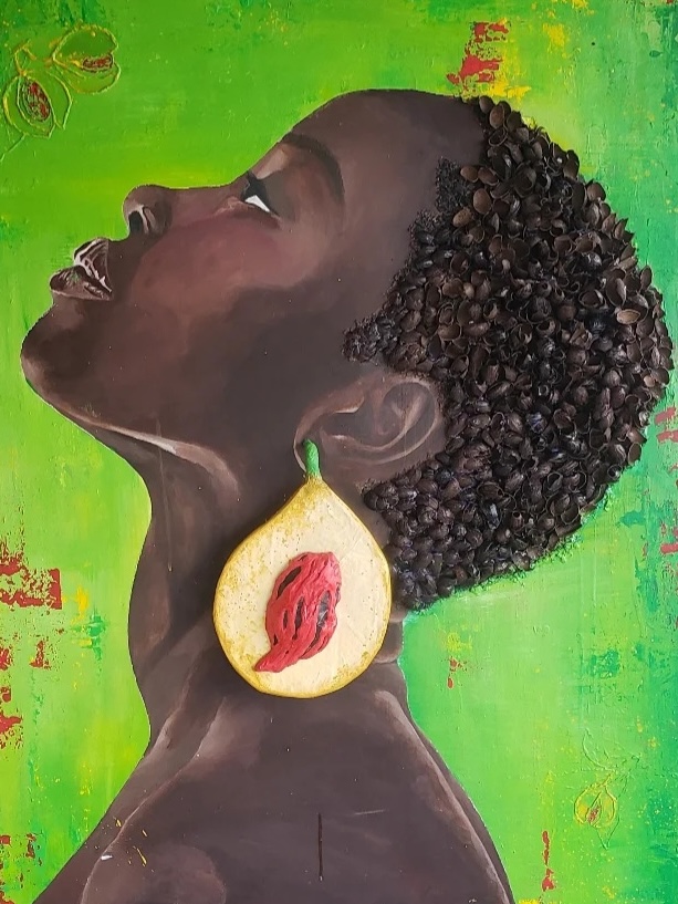 This regal piece celebrates black beauty and the treasure Grenadian spice, the nutmeg. Miss Meg is focused and poised. Her neck and back strong; typical features of the ‘women of the soil’ involved in nutmeg miming. The nutmeg her earring is represented as the Grenadian map encased in a golden pod emblematic of the spice’s nickname “black gold.”