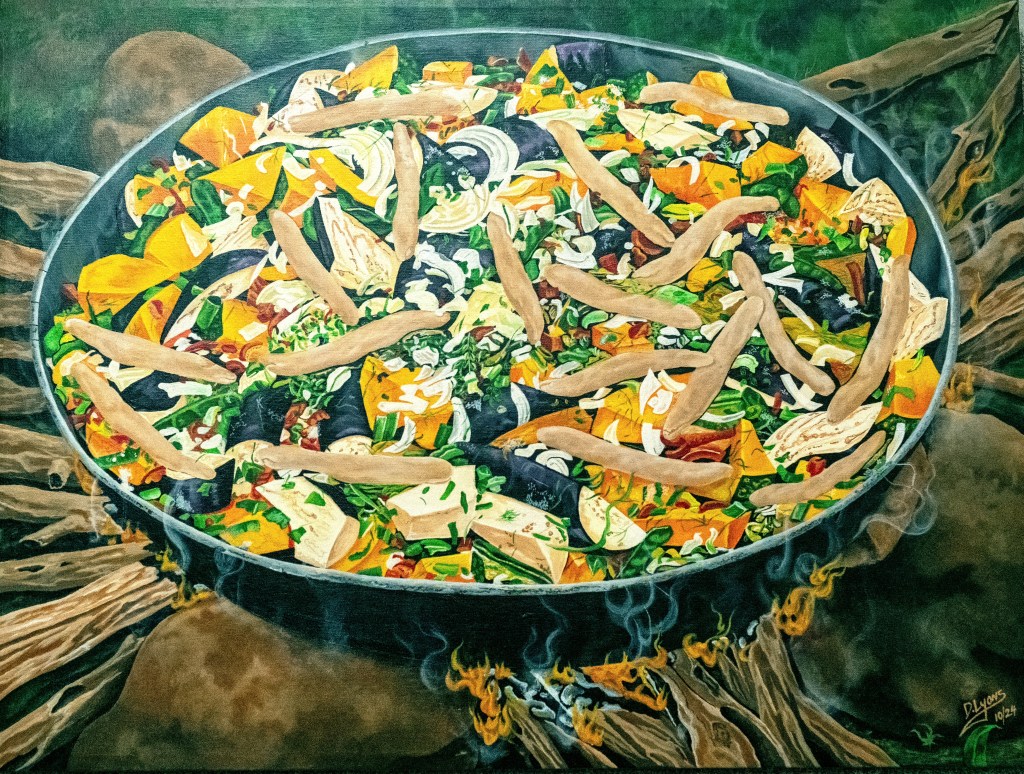 As my hand held the brush and the paint interacted with the canvas, I could smell the infusion of flavors emitting from within the painting. With my lips smiling, my taste buds rejoice with excitement as the Ital Oil Down bubbles over the Cinnamon wood. Even the viewers anticipate this meal.