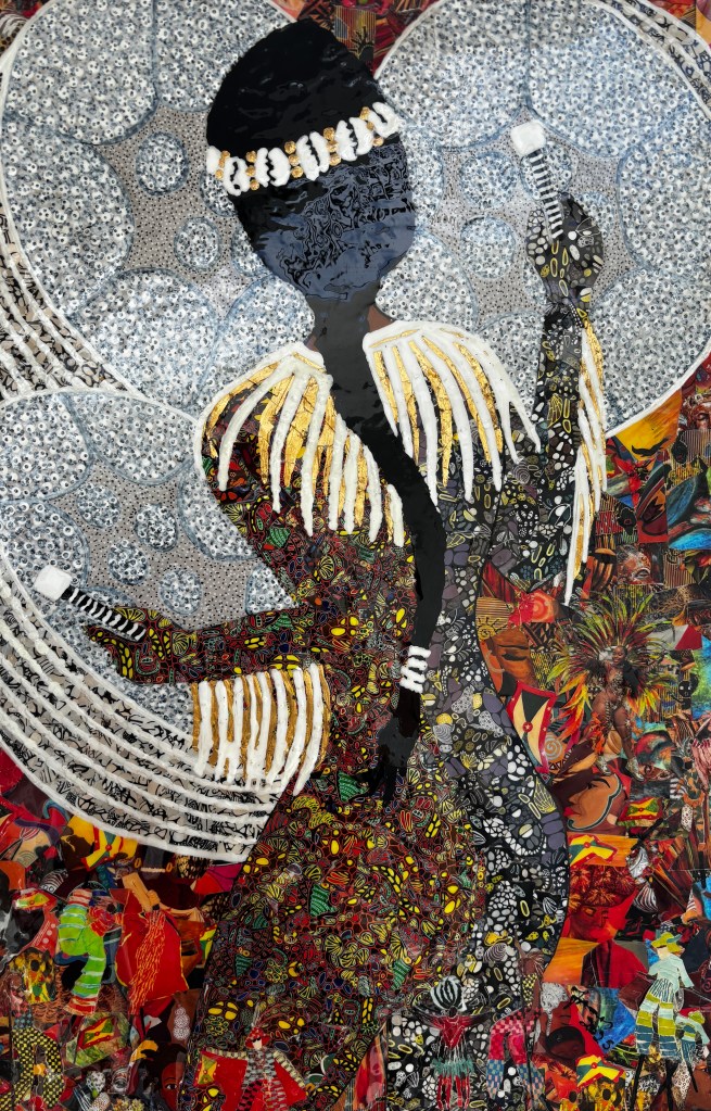 2) 24”x30” epoxy resin over paper mosaic. This piece displays a woman beating pan. She is created by the piecing together of hundreds of photographs.