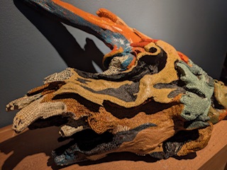This piece exhibits a version of Spice Mas in Grenada with Moko Jumbie, Short Knee, and Jab Jab.