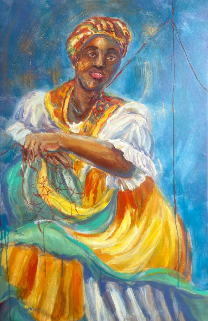 My painting, “Rooted in Rhythm,” celebrates Grenada’s traditional dance as a powerful expression of history, freedom, and cultural continuity. Created using acrylic on canvas, the painting uses dynamic figures and rhythmic exchange to reflect how movement and music serve as vessels of memory, resistance, and joy. This work highlights traditional dance as a living force that continues to unite and define the Grenadian spirit.