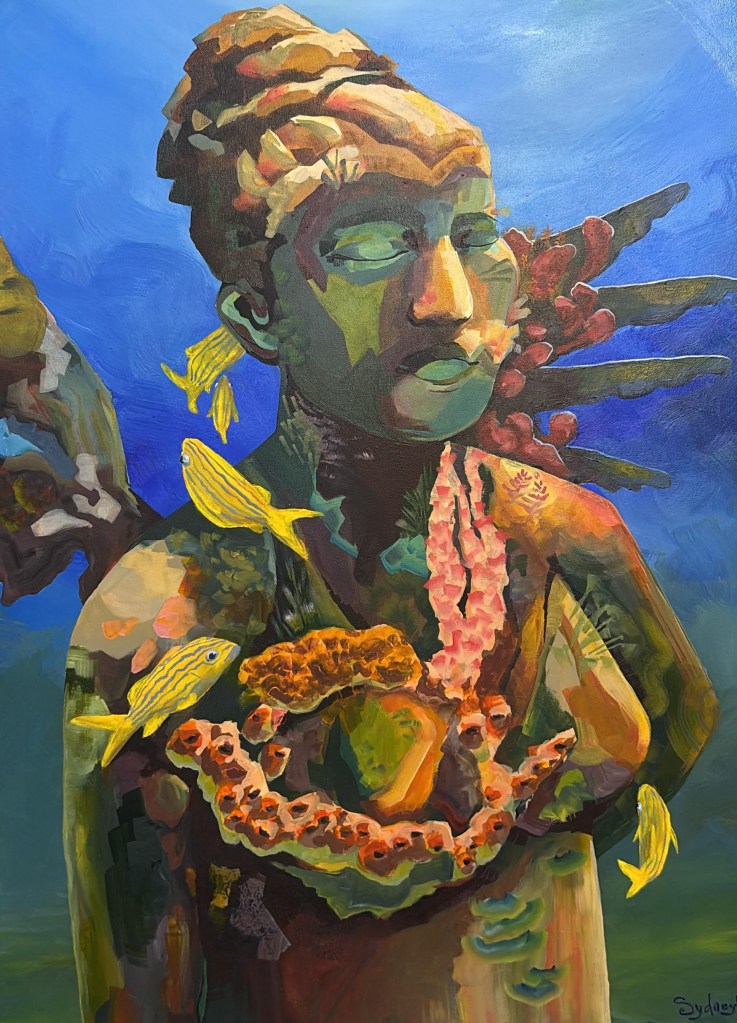 This painting serves as a cultural tapestry. At the center lies a hot bowl of Oil Down, our national dish, and our flag being held by a proud Grenadian. The foreground is set by our island’s famous spices: nutmeg and cinnamon, and rich cocoa, grounded by the bougainvillea, our national flower. In the distance, the lush mountains represent where our waterfalls resides, the white sandy beaches that everyone talks about and the rhythmic energy of Carnival revelers on the shoreline captures the nature of the island, its serene natural beauty and its vibrant, unbreakable spirit. This piece is a comprehensive celebration of what it means to be “Spice Isle” proud.