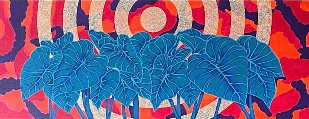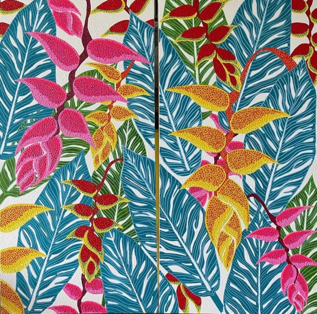 Kristianne Buxo is a self taught artist working in acrylic and mixed media. Deeply connected to her Grenadian heritage and identity, she takes much of her inspiration from the island’s culture and flora. Known for her use of bright colours, patterned dot work and pointillism, her paintings are a combination of representational and abstract art.